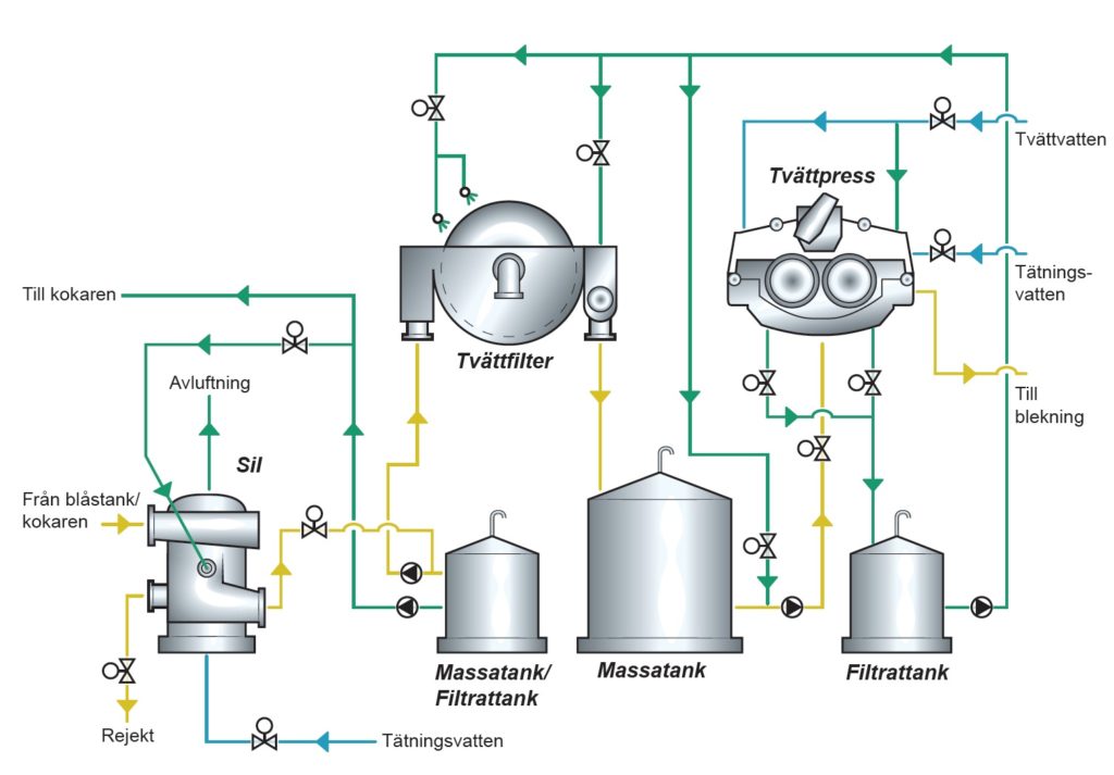 Tvättprocessen är utformad för att separera svartluten från massafibrerna så effektivt som möjligt med minst utspädning av luten. Den utrustning som används kan vara tvättfilter, tvättpressar, kontinuerliga diffusörer etc.