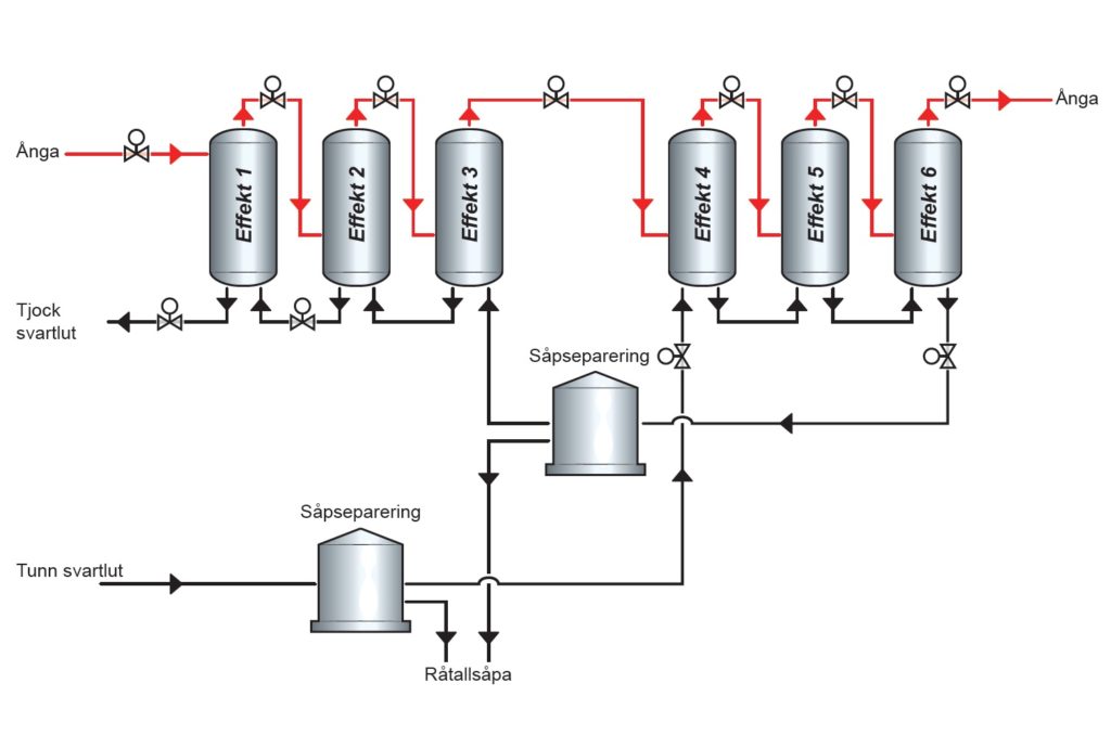 Genom en rad indunstare – i grunden värmeväxlare – som arbetar vid gradvis lägre tryck, används ångan från ett steg för att värma nästa steg. Normalt sker indunstning i sex eller sju steg, ofta kallade effekter. Ånga vid tryck går in i den första effekten. Trycket och temperaturen sjunker från effekt till effekt. I exemplet pumpas den svaga svartluten in i den fjärde effekten och den tjocka svartluten avlägsnas från den första.